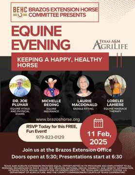 Join us for the Brazos Extension Horse Committee’s Annual Equine Evening — a beloved FREE event for over a decade, bringing together horse enthusiasts from across the Brazos Valley.